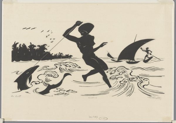 Editor: This is "De bui," or "The Shower," a woodcut print made around 1925 by Johannes Frederik Engelbert ten Klooster. It shows three figures struggling in a boat during a storm. The thick, dark lines give it a really dramatic feel. What stands out to you? Curator: The raw materiality of the woodcut itself speaks volumes. The stark contrast, the deliberate gouges creating light and shadow – it forces us to consider the physical labor involved in its production. Think about the tools, the artist’s hand, the very tree it came from. What kind of labor do you imagine produced this, and for what purpose? Editor: It looks really difficult to carve! I guess someone probably spent a lot of time on it, so it feels counter to the urgency of the scene, which depicts the struggle in the shower in this simple medium. So how did he manage to produce something this refined and also rugged? Curator: Exactly. This isn’t some pristine, mass-produced image. The visible grain, the slight imperfections—these are testaments to the individual artistry and craft. And it’s crucial to place this in its social context. Consider Expressionism, with its roots in social commentary and concern for the human condition. Were such scenes something people commonly encountered? Editor: Perhaps! What can that history of labour or the purpose of depicting a “common man” escaping the storm mean for the purpose of its viewers and owners? Curator: Precisely! Thinking about labor processes and material contexts of both production and consumption—who made it and why, as well as for whom?—allows for new avenues to see value in artwork. Editor: I never thought of it that way before, but it really highlights how connected the physical act of creating art is to the message it conveys. Curator: It also questions the role of the ‘artist-genius.’ This wasn't solely about some isolated artist having a creative outburst. It’s about skill, material availability, the social realities they sought to represent, and that means more than just pretty paintings.
