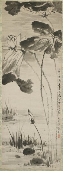 Huang Shen created this scroll painting with ink on paper, sometime between the late 17th and mid-18th century. Huang Shen lived during the Qing Dynasty, a period marked by both cultural flourishing and strict social hierarchies. Looking at this piece, you get a sense of the literati aesthetic valued at the time, emphasizing personal expression over pure representation. The lotus isn't just a flower here; it’s a symbol deeply rooted in Buddhist and Chinese culture, representing purity, enlightenment, and rebirth. The bold, spontaneous brushstrokes, coupled with the poetic inscription, suggest a deeply personal and reflective moment for the artist. Huang Shen was part of a group of artists known for their individualistic styles, rebelling against the more academic and conservative art establishment. With its simple yet profound imagery, this Rolschildering invites us to meditate on the beauty and resilience of the lotus, connecting the personal with the universal.