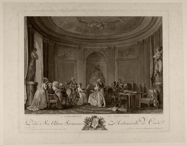 Editor: This is "Assembly in the Salon" by François Nicolas Barthélemy Dequevauviller. It pictures a gathering in a very ornate room. What can you tell me about the social context of an image like this? Curator: This print offers a glimpse into the aristocratic culture of the 18th century. Salons were crucial spaces for intellectual and social exchange. Notice how the architecture itself seems to reinforce the idea of status and privilege. Editor: It's interesting how the setting is almost as important as the people. Curator: Exactly! The architecture is meant to impress, serving as a backdrop for the display of wealth and refined taste, don't you think? Editor: I see what you mean. It's all about projecting an image of power. Curator: Indeed. Analyzing art through its historical and social context reveals so much about the values of the time.