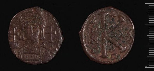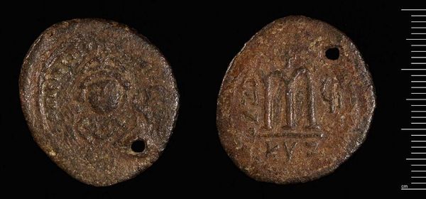Curator: This coin, attributed to Justin II, now resides in the Harvard Art Museums, and weighs approximately 12.46 grams. Notice the material quality and patinated surface. Editor: Yes, it's quite small, but the rough texture and deep reddish-brown tones convey a sense of antiquity and durability, almost like looking at something primordial. Curator: Precisely, consider how the imagery itself is constructed. On one side, we see a large 'M', possibly a denomination marker, flanked by other symbols. The reverse shows figures, perhaps emperors, and the eagle of Byzantium. Editor: And what do these symbols communicate about the socio-political landscape of the time? Was this coin meant to project imperial power, or facilitate trade, or both? Curator: Most likely both. Coins always serve dual purposes. Note the care the engraver took in rendering the eagle and imperial figures, despite the coin's relatively small size. Editor: Seeing it this way provides a lens into Byzantine society. What a fascinating relic! Curator: Indeed, a small object, but rich in design and implications.