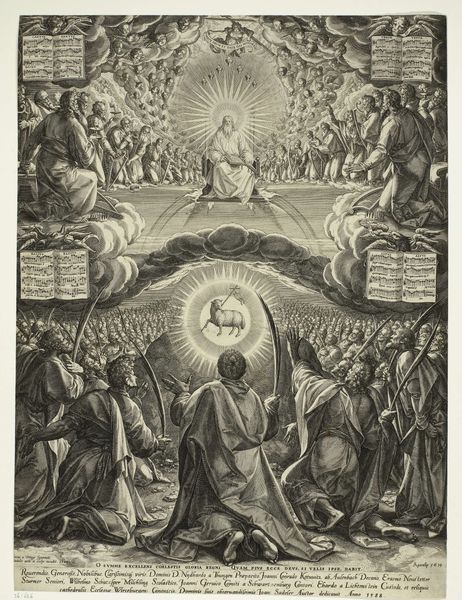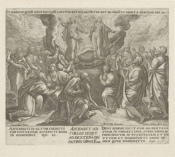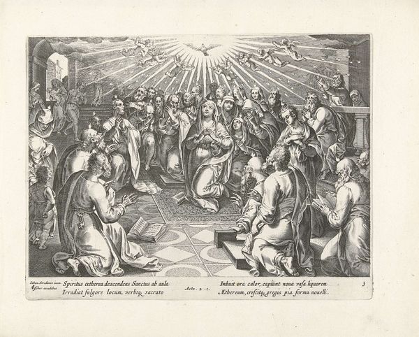 Curator: Philips Galle created this engraving, "The Descent of the Holy Ghost," in 1582. It’s an intriguing example of Italian Renaissance printmaking, currently held here at the SMK. Editor: My initial reaction is how theatrical it feels. The stark contrasts create such a dynamic scene. It’s as if a stage spotlight is illuminating Mary at the center. Curator: Right. And the medium itself—engraving—wasn’t merely reproductive; it was a critical means of distributing and interpreting artistic and religious ideas. Think about Galle’s workshop, churning out these prints for a broad market eager for imagery. Editor: Yes, the production aspect makes you consider the level of accessibility it provided at the time, far and wide! But returning to that central light, you see how the artist captures this moment of divine encounter. What must it have been like for those witnessing this event? Curator: The composition here is also carefully constructed. Notice how the dove at the top, symbolizing the Holy Spirit, radiates downwards, connecting with the figures through these sharp lines. And consider that the Italian Renaissance was intensely interested in perspective and creating believable spaces. Editor: True, there's almost a geometry to the emotion! A divine spark and also an artistic calculation to make this vision "real" and palpable. Yet those cherubic faces are very sweet. I am drawn to the expressions – the awe, the fear… such delicate renderings from the etching. Curator: Well, it really speaks to the engraver's skill in using lines to create form and texture. You get a very strong sense of three-dimensionality, even though it’s a two-dimensional image on paper. What I find significant, beyond artistic ability, is how the commercial aspect drives stylistic decisions to meet demands. Editor: Agreed! Thinking back, it feels deeply intimate, to have had a little reproduction like this and what personal connection that afforded in one's life and contemplation, no? Curator: Definitely gives you food for thought as you continue through the collection! Editor: Thanks, I feel I can now fully absorb my surroundings in our journey through the gallery.