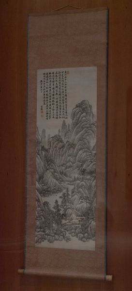 Editor: This hanging scroll, "Go Game in the Pine Pavilion" by Oda Kaisen, it's just so serene. The muted colors and flowing lines create such a peaceful atmosphere. How do you interpret this work? Curator: It whispers of harmony, doesn't it? The scholars at their game, nestled within nature... Oda Kaisen invites us to contemplate the relationship between humanity and the natural world. The mountains seem to cradle the pavilion, creating a sense of belonging. Do you feel that connection as well? Editor: I do, now that you mention it! I initially just saw a pretty landscape. Curator: Art has a funny way of revealing its secrets, doesn't it? I find something new each time I look. Editor: I'll keep that in mind when I look at art from now on!