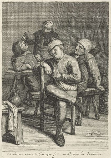 Curator: Isn't there something both cozy and unnerving about this drawing? "Three Men at a Table Smoking and Drinking," created in 1772 by Leendert Brasser. It's an ink drawing on paper, and you can find it here at the Rijksmuseum. Editor: Definitely. I’m immediately drawn to that reveler on the left hoisting his glass. His joyful expression is almost… manic? The scene reads as camaraderie mixed with something a little darker. Curator: It really captures a genre scene from the Dutch Golden Age, all realism and group portraiture wrapped into one slightly disquieting package. It reminds me how deeply intertwined tobacco and alcohol were with social rituals, practically sacred elements of gatherings! Look at the almost devotional gaze of the figure pouring the drink! Editor: Right, and there's so much symbolism simmering beneath the surface. Tobacco and alcohol, historically, are connected with notions of male bonding, but also excess and escapism. It reminds us how readily joy can turn reckless when unchecked. That empty shelf above them only emphasizes the scene's desolation. Curator: It’s interesting to think about that relationship, and also the historical understanding of class dynamics during that period and where drinking culture fell inside it. How were these leisurely pleasures intertwined, yet also divisive, for people depending on your income and profession. Did they offer solace or further entrapment? Editor: True! And considering its style borrows from the baroque— known for its extravagance and dramatic contrast– this image plays tricks on you. It looks folksy, a common, even comforting scene at first glance, but, upon deeper inspection, you see the baroque tension between what appears jovial, and what can be interpreted as subtly tragic. It makes you wonder about those individual lives, suspended in a timeless drawing... Curator: A boisterous gathering on paper! Now I'm picturing how it's evolved. A tangible piece of time, echoing down to our age. Editor: An enduring testament to simple pleasures and potent, hidden depths, wouldn’t you say? I guess some symbols truly speak beyond any language.