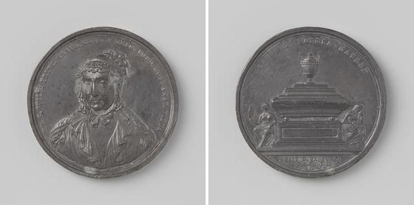 This is a silver medal commemorating the death of King William II in 1849, created by Johannes Petrus Schouberg. It compels us through its contrasting surfaces and symbolic composition. On one side, we observe a high-relief profile of the King. The stark linearity of his bust contrasts with the circular field, creating a tension between the individual and the collective. On the reverse, the allegorical figure of a grieving woman leans upon a plinth, her form echoing the somber mood. The medal operates as a sign; its imagery and inscriptions are not merely representational but work as a language to convey loss and remembrance. Consider how the circular form itself symbolizes continuity, challenging the finality of death. Schouberg invites us to reflect on how symbols function to negotiate complex emotions within a structured framework. The medal serves as a cultural artifact, prompting continuous dialogue on how we memorialize and interpret history.