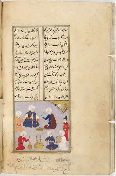 Curator: This illuminated manuscript page from Yahya Beg's "The Shah and the Beggar" feels like stepping into a jewel box of a dream. The vibrant blues and reds against the aged paper whisper tales of forgotten courts. Editor: It's amazing! What strikes me is the contrast between the meticulous text above and the almost playful painting below. How do you interpret the scene depicted? Curator: I see a celestial gathering, perhaps angels attending a royal figure. The artist uses bold colors and floating figures to create a sense of otherworldly splendor. Notice how the figures seem suspended, almost dancing, in that vibrant blue field. Editor: It’s interesting how the details in the painting don't seem to connect with the text exactly. It makes you wonder about the relationship between the stories and the illustrations. Curator: Exactly! It invites a deeper exploration, doesn't it? Perhaps the image serves as a symbolic commentary on the text, adding layers of meaning.