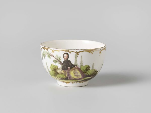 Editor: This is a porcelain cup, made before 1771 by the Weesper porseleinfabriek, painted with figures in landscapes. It's like a little world painted on a delicate surface. I wonder, what stories do you think are captured in this piece? Curator: Ah, stories! This cup whispers of simpler times, doesn’t it? It’s tempting to get lost in the miniature landscapes… It reminds me of Wes Anderson, that distinct framing, it invites a little playful observation. Rococo was obsessed with whimsy, capturing a carefree idyll. It's a slice of theatre set on porcelain. What about the figures themselves? Anything catch your eye there? Editor: Well, their clothes are quite fancy, almost like they are dressed for a play. But what is the play about? Is it about love, loss, or something more everyday? Curator: Precisely! It's that ambiguity that keeps me hooked! It is intriguing to see little scenes playing out on functional objects. These porcelain pieces are miniature records of that period's entertainment, aspiration and social structure, aren’t they? And imagine drinking your morning brew from it today… talk about setting a mood! What modern-day ritual would mirror this cup’s sentiment, I wonder? Editor: It’s like having a tiny, theatrical window into the 18th century. I now look at it not as a simple cup, but as a container of stories. Curator: Exactly! Isn’t it remarkable how an everyday object, adorned with artistry, can become a portal? Perhaps all objects are just waiting to reveal their stories.