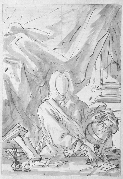 Curator: Ah, Carpeaux's "Dancing Figure," a sketch from the 19th century held here at Harvard. It feels like a whisper of movement, doesn’t it? Editor: The raw process is what grabs me—pencil on paper, immediate, unburdened by the need to resolve form. It’s all about the energy of creation. Curator: Exactly! I see a figure caught in mid-twirl, a whirlwind of fabric and limbs, almost ethereal. The sketchiness lends it a dreamlike quality. Editor: Dreamlike, but also intensely physical. Look at the pressure of the lines, the visible struggle to capture that fleeting motion. It’s labour made visible. Curator: I'm struck by the freedom, the lack of constraint. It’s as if he’s chasing an idea, a feeling. Editor: Perhaps exploring the cost of chasing dreams, of the physical toll artistic expression takes, there is something very telling in the medium, nothing to hide. Curator: In the end, it feels like a glimpse into Carpeaux's artistic soul, a fleeting moment of inspiration captured on paper. Editor: A testament to the power of material, process and labour to transform a simple medium into something so evocative.