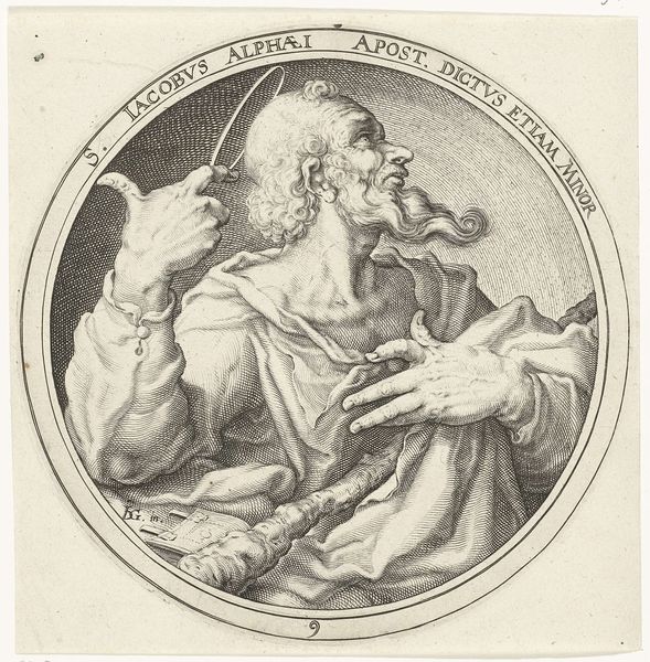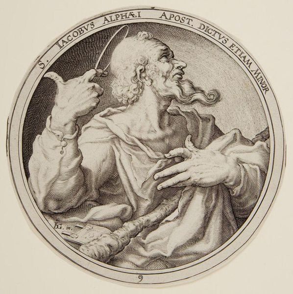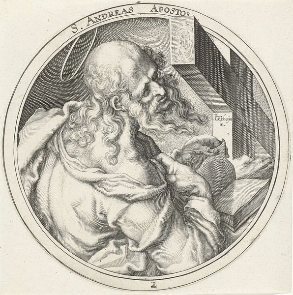 Curator: Here we have Zacharias Dolendo's "Saint Matthew," a small but potent engraving. It measures about 6 inches square. What’s your first take? Editor: It feels… introspective. Like Matthew is caught in a moment of deep thought, almost troubled by what he’s writing. Curator: Yes, the labor of writing, of committing ideas to paper, is palpable. Look at the precision of the engraved lines, mimicking the deliberate act of inscription. And the paper itself, the cost of such materials at the time. Editor: The way the light falls, it almost feels like he’s illuminated by his own inner light. What do you think he’s pondering as he writes? Curator: Perhaps the societal implications of his words, the power they hold. The printmaking process allowed for wider distribution, thus democratizing access to religious texts. Editor: It's a pensive piece. Curator: Indeed, a testament to both faith and the transformative potential of accessible knowledge.