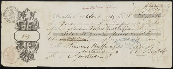 Editor: Here we have the "Médaille de Sainte-Hélène," a print on paper, dating back to 1857-1858, awarded by the Duc de Plaisance. It has a decidedly official, almost bureaucratic feel to it. What catches your eye about this piece? Curator: The composition strikes me immediately. Observe how the print is framed by a precise border, within which various textual elements are carefully arranged. The typography itself, with its shifts in weight and style, creates a visual hierarchy that guides the eye. Consider, too, the almost ghostly presence of the crowned portrait; it isn't merely representational but a graphic device contributing to the overall texture. What is the relationship between these elements, would you say? Editor: So, you see it more as an exercise in visual organisation rather than, say, a historical document? Curator: Not exclusively, no. But one must acknowledge how form mediates content. The deliberate layout, the contrast between the rigid frame and the flowing script – these create a tension that communicates authority and commemorates achievement, yes? Furthermore, what meaning do we assign to the imperfections of the paper and ink; age has altered the medium and, to some degree, impacted the message. Editor: I hadn't thought about how much the physical presentation adds to the meaning. Now that you point it out, I notice it’s much more than just a piece of paper with words on it. Curator: Precisely. This interplay between visual form and intended function is crucial. To analyze that relationship enables a deep engagement with visual art. Editor: That's a good point. It has me thinking about the purpose of an image like this beyond just the information it conveys. Thank you.