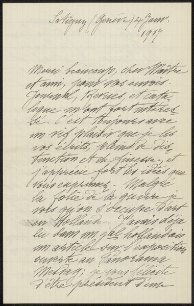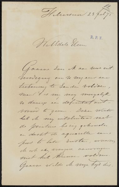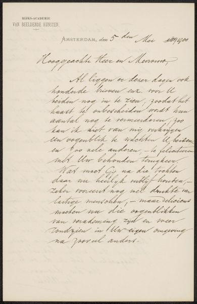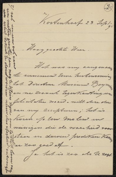 Jozef Israëls made this copy of a letter to Samuel van Houten in 1894, using paper and ink. Although these materials are conventional for writing, their use here connects to broader questions of artistic labor and social advocacy. The paper itself, likely mass-produced, speaks to the increasing accessibility of writing materials during the late 19th century. Ink, a mixture of pigment and binder, would have been readily available. Israëls' choice to create a copy suggests a deliberate act of preservation, a careful transcription meant to highlight its contents. The act of handwriting itself, a skill cultivated through education and practice, imbues the letter with a personal touch. Consider the social context: Israëls, a prominent painter, writes to a government minister. The letter's content, concerning the placement of paintings in the Rijksmuseum, underscores the intersection of art, politics, and national identity. The labor involved in producing this copy is minimal, yet it signifies a conscious effort to engage with power structures and advocate for artistic values. Ultimately, this letter serves as a reminder that even seemingly simple materials and processes can carry significant cultural and political weight. It blurs the line between artistic expression and social commentary, challenging us to reconsider the boundaries of art itself.