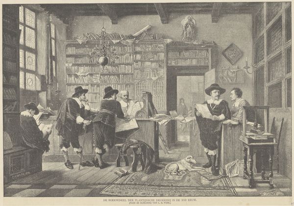 Curator: Let’s consider this print by Eugène Louis Pirodon, made between 1884 and 1885. It’s titled “Klokkenmaker in zijn werkplaats” – “Watchmaker in his workshop.” Editor: A scene steeped in shadow and detail; it’s instantly cozy, even with the stark greyscale. A sort of everyday magic permeates this crowded, intimate space. I immediately wonder what the relationship dynamics are among these figures—like captured whispers from a simpler, pre-digital age. Curator: Indeed, that effect may be thanks to the engraving technique, lending a very specific texture. The artist presents this artisan's labour in detail. I am most interested in the organization of labor that constitutes domesticity intersecting with the commerce. Notice, for example, how the work space blends with the living quarters and different generations. Editor: Absolutely; it feels like a narrative unfurling right before our eyes. I feel pulled into their world; a vignette of family life intersects craft, patience and concentration. There is something so calming to imagine. Perhaps, in this age of mass production, seeing the focused work ethic has its own nostalgic charm? Curator: It serves to challenge our conception of fine art, too. An artwork celebrating, but also, documenting, craft. How do we assign value to this artwork that presents labor so directly? It serves to elevate that act of the ‘everyday.’ The family observes while the father toils away! What about its positionality interests you further? Editor: Positionality indeed. The clockmaker hunches over his work with what feels like profound care. The faces of those around him tell so much—quiet patience and attentiveness as the central male repairs. It invites contemplation about the passing of time, and the preservation of memories contained in those objects. Even more poignantly it serves as a marker to celebrate our artistic practice. Curator: So we agree: that Pirodon’s "Klokkenmaker in zijn werkplaats" engages a range of concerns relating to value, class and work during its historical moment, made explicit in its rendering. It certainly holds those narratives. Editor: Exactly. What starts out as just a small-scale print explodes with relevance.