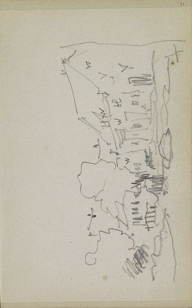 Editor: This drawing, titled "Gezicht op een gebouw aan het water" by Adrianus Eversen, dates back to sometime between 1828 and 1897. It’s primarily pencil, and perhaps a little watercolor. There's something so fragile and fleeting about the sketch. How do you see the composition working here? Curator: The composition presents a compelling study in line and form. Note the architectural structures, delineated through a delicate network of pencil strokes. Observe how the artist employs hatching and cross-hatching to suggest depth and volume. Do you notice the interplay between the solid forms of the building and the implied fluidity of the water through purely linear means? Editor: I see what you mean about the contrast. The sketch feels both precise and kind of hazy at the same time. Curator: Precisely. This dichotomy arises from the tension between the linearity and its delicate, almost tentative execution. The sparseness invites the viewer to actively participate, completing the image with their own perception. What significance might be ascribed to this aesthetic choice, do you think? Editor: Maybe it's about capturing a momentary impression? It doesn't feel as "finished" as other architectural drawings I've seen, more like a quick observation. Curator: Indeed, and from a formal perspective, this immediacy becomes the focus. The architectural elements themselves become secondary to the experience of the artistic process itself, rendered visible through the sketch. There's a self-reflexivity at play, in that sense. Editor: I hadn’t considered the self-reflexivity of it, that’s really fascinating! I appreciate seeing it in a new light, focusing on the technique.
