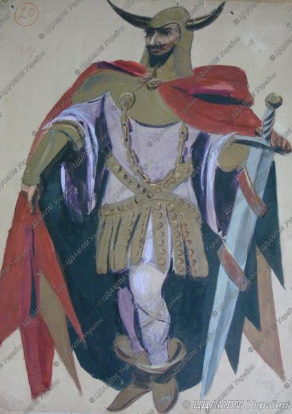 Editor: This is Boris Kustodiev's "Kiselvrode," painted in 1924, using watercolor. It's…certainly striking. The costume is so elaborate and the figure itself is rather…eccentric. How do you interpret this work, looking at it from an art expert's perspective? Curator: Well, observe how Kustodiev has manipulated line and form. Note the deliberate exaggeration of the figure’s features – the elongated nose, the sloping shoulders. How does that play against the geometric exactness of the costume's ornamentation, all those meticulously rendered triangles and stripes? Editor: I see what you mean! It's like a contrast between organic and geometric shapes, maybe suggesting tension between the character and his social role as presented in the costume? Curator: Precisely! And consider the color palette. The juxtaposition of the vibrant reds against the stark white, and that daring splash of blue on his strange headpiece. Do these choices seem arbitrary or are they carefully considered? How do they work together? Editor: It seems deliberate, I mean the boldness and variety make the portrait more dynamic and draws my eye through every bit of detail across the surface of the paper. Are these dissonances reflective of the Russian avant-garde? Curator: Indeed. The piece plays with contrasting colors and shapes within the subject and uses bold exaggeration to challenge the classical portrait standards. Editor: I never would have caught so much detail if you hadn’t pointed it out! I had a knee-jerk reaction, and now I appreciate how strategically constructed the piece actually is. Curator: Art, after all, is about learning to truly see. It's like, every work contains countless opportunities for close formal examination.