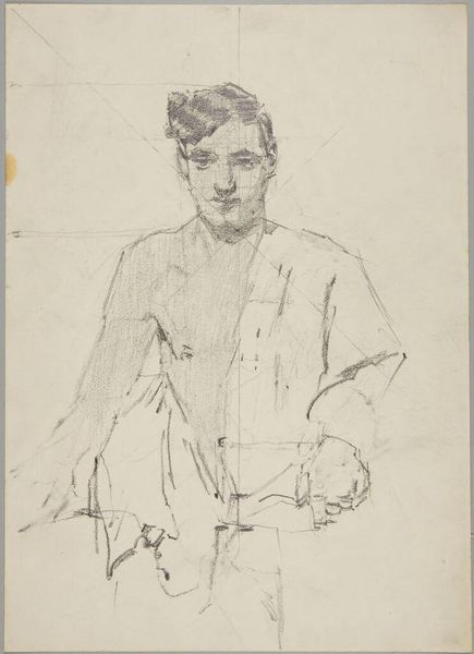 Curator: This is Denman Waldo Ross's pencil drawing "Charlie Parker," from 1931, part of the collection here at Harvard Art Museums. Editor: It feels like an early study, doesn't it? The pencil lines are so light, almost tentative, focusing on the raw materials of the paper and graphite. Curator: Ross was deeply involved in the Arts and Crafts movement; he believed in democratizing art by emphasizing design principles accessible to everyone. Editor: The visible construction lines tell us something about process. What kind of labor went into this drawing, and for whom? Curator: Ross used his artistic platforms to promote ideas about social harmony through aesthetics. This drawing likely served as a preparatory sketch for a larger project. Editor: So, even this sketch contains the seeds of his larger social project? It's interesting to think about how the materials and method themselves become political. Curator: Exactly. For Ross, art was a means to shape society's values. Editor: It adds depth to what could be seen as a simple portrait. Curator: A quiet piece but full of intention. Editor: Deliberate even in its simplicity.