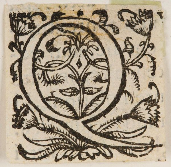Curator: Here we have "Letter Q," an intriguing piece by an anonymous artist, part of the Harvard Art Museums' collection. Editor: Oh, I'm immediately drawn to the stark contrast of the black ink against the paper. It has a sort of medieval, woodblock print feel. Curator: It does, doesn't it? Notice the floral motifs intertwined with the letterform, and the tiny rabbit perched delicately within. I wonder what the artist wanted to communicate with that addition. Editor: Perhaps a commentary on the hidden vulnerabilities within language itself, or maybe the precarity of existing when being framed by dominant social structures. That rabbit is a powerful symbol. Curator: Or maybe, it just needed a touch of whimsy. Sometimes the simplest answer is the most delightful. This piece reminds us of the beauty in ordinary things. Editor: Well, either way, it's a potent reminder that even the most mundane elements can hold layers of meaning, consciously or not.