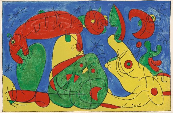 Editor: This is "Dog Barking at the Moon", a collage and painting by Joan Miró from 1952. It’s playful, almost like a child's drawing, with bold shapes and vibrant colors, but something feels…uneasy. What do you see in this piece, Professor? Curator: Ah, Miró. He invites us into his inner cosmos, doesn’t he? I find "Dog Barking at the Moon" to be a glimpse into a dreamscape, a dance between joy and the unknown. The bold colors, they’re not just pretty—they're emotional triggers. Notice how the black moon contrasts with the bright yellow. It is playful but primal, echoing both the wonder and the fear inherent in the natural world. Doesn't it almost howl off the canvas at you? Editor: Yes, now that you point it out, the colors do seem to have their own voice, and it feels slightly… aggressive, not just happy. But what about the figures themselves? They are so abstract! Curator: Exactly. Miró is giving us the essence of a dog, a moon, not a literal depiction. Think about it: what *is* the essence of a dog barking at the moon? It is mystery and impulse, maybe frustration. I always wonder if it howls back at the viewers? And does it remind you of a specific place or memory? Editor: I never considered that, actually. Looking at it that way, it feels almost… personal, as if each shape and color represents something specific to Miró. The geometric shapes create a world for the subconscious to roam. It is so interesting! Curator: That’s the beauty of it, isn’t it? Art as a mirror reflecting something within ourselves, transformed by Miró's imagination. Perhaps "Dog Barking at the Moon" is not just a painting, but a riddle, one only the individual viewer can solve, for themselves. Editor: It does that perfectly. I feel like I’ve unlocked another door to appreciate abstract art. I’m starting to howl back. Curator: Wonderful, because sometimes art demands to be answered.