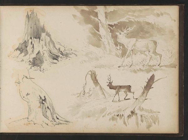 Curator: At first glance, it’s wistful and muted, almost dreamlike with its shades of brown. It whispers more than it shouts, you know? Editor: Indeed. We're looking at "Mountain Landscape with Two Deer near Trees and Shrubs," a watercolor and ink drawing by Johannes Tavenraat, created in 1858. It’s part of the Rijksmuseum collection. What do you think is giving it that whisper quality? Curator: It’s the monochromatic palette, mainly, but also how the artist handled the watercolor. It’s so translucent, allowing the paper itself to breathe and glow. The mountain in the distance seems to dissolve into the sky. The deer feel ethereal. Like spirits. Editor: Tavenraat was working during the Romantic period, and we see a strong engagement here with nature as something sublime and almost unknowable. He exhibited frequently throughout the Netherlands. Deer are very common in Romantic painting. How might this depiction relate to the common motifs within the broader historical context? Curator: Maybe they represent an untamed wildness, existing separately from humanity in the face of an industrializing world. Look how the distant deer almost blends with the shadows behind. We see its antlers before the body. But who can own such a vision? What part can society claim of that? Editor: Precisely, romantic artists frequently employed particular tropes, which is maybe why they continue to be so popular! This feels almost like an imagined space—not a particular landscape but one drawn from memory and emotion. I wonder how Tavenraat’s patrons saw this drawing back in the day. Was this drawing commissioned, or perhaps displayed in a gallery? Curator: Perhaps it gave some city dweller a glimpse into a world untouched, unspoiled. Like a fleeting moment of peace amidst the urban bustle, and maybe offered some recognition of what was quickly disappearing even then. I wonder what the effect was. Did these pictures trigger remorse? A responsibility of care, or the fantasy of escape? Editor: It speaks to how the Romantics presented art as a refuge from modernity and a space for a specific type of experience—personal, contemplative, melancholic. It’s not a rejection but maybe a lamentation. Curator: Yes, there is so much longing. What could have been... Or perhaps still could be. A warning from the wild. Editor: Very evocative, thank you.