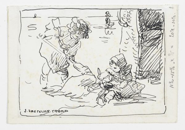 Charles Samuel Keene created "Tract Distributor," a pen and brown ink drawing, now held at the Metropolitan Museum of Art. The sketch, filled with brisk, confident lines, captures a fleeting street scene with layered depth. The cross-hatching technique adds volume and texture, especially visible in the woman's ruffled dress. Consider how Keene uses line not just to depict form but to animate the scene. Note the deliberate compositional choices – the layering of figures creates a sense of depth, while the positioning of the tract distributor at the forefront draws immediate attention, the linear construction invites the viewer to follow narrative threads. Keene masterfully captures a moment of social interaction, inviting us to reflect on themes of communication, class, and the everyday exchanges that shape our understanding of society. The seemingly simple sketch becomes a lens through which we can examine the complexities of human interaction.