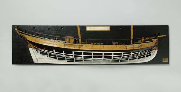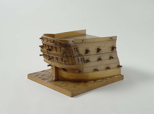 This is a model of a 90-Gun Ship made at 's Lands Werf Amsterdam. Notice the intricate wooden framework that makes up this model. Its honeyed hues give it a warm, inviting feel, despite the rigid, geometric forms that define its structure. What we see here isn't just a ship; it's a deconstruction. The artist exposes the ship’s internal architecture. The rows of square openings create a grid-like pattern which is interrupted by the soft curves of the ship’s hull, offering a contrast between industrial precision and organic form. The texture of the wood adds another layer, as its grain and imperfections create a sense of depth and history. This piece invites us to consider ideas of transparency and revelation. By exposing the ship's inner workings, the model destabilizes our conventional understanding. The model prompts us to reflect on what is hidden beneath the surface, suggesting that true understanding comes from dissecting and analyzing constituent parts.