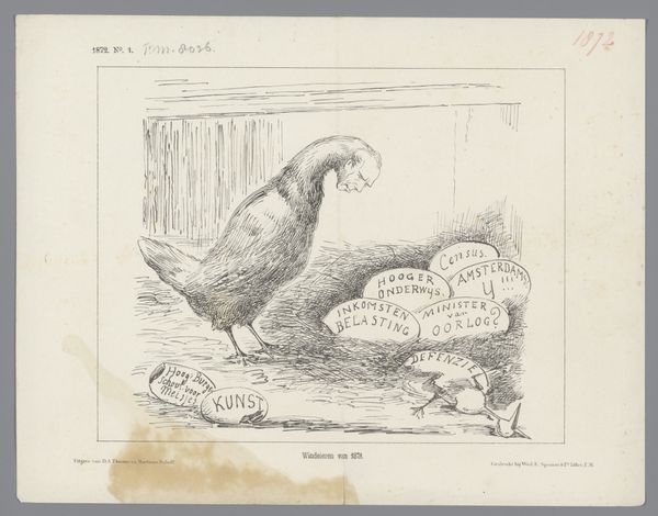 Johan Michaël Schmidt Crans created this lithograph titled 'Spotprent op de troonrede' in 1885. At first glance, one is confronted with a stark composition of dark ink on a light background, dominated by an ostrich burying its head into a watery landscape. The lines are precise yet gestural, forming a dense, almost chaotic texture on the bird's body, which contrasts sharply with the smooth, elongated neck. This formal juxtaposition evokes a sense of unease, highlighting the central theme of denial. The ostrich, a well-known symbol of avoidance, is placed beneath a list of pressing social and political issues written in a deliberately casual script. The composition thus becomes a visual commentary on the act of ignoring problems. By using the ostrich as a signifier, Schmidt Crans leverages a recognizable cultural code to critique governmental inaction. The choice of lithography as a medium further emphasizes the political nature of the work. The stark, reproducible lines suggest a medium intended for mass dissemination, aiming to provoke public discourse on these unresolved issues.