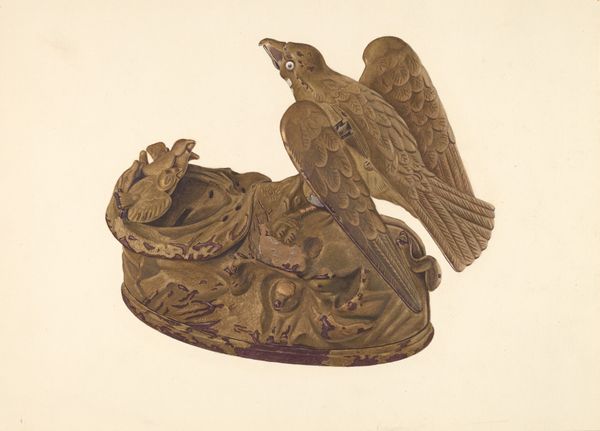 Adolph Opstad created this watercolor painting of a potpourri jar, adorned with an eagle, sometime in the late 19th or early 20th century. Opstad, who lived a long life spanning from 1855 to 1995, would have witnessed immense change; he would have been exposed to varying cultural, technological, and political shifts that would have inevitably influenced his art. The eagle, often associated with freedom, power, and the United States, takes on a decorative form here, adorning a potpourri jar. It invites us to consider the ways in which symbols of national identity are domesticated and integrated into everyday life. The choice of rendering this object in watercolor gives the work a delicate, almost dreamlike quality, which contrasts with the bold, assertive symbolism of the eagle itself. The speckled blue and white pattern adds another layer of complexity, softening the object's imposing presence. The painting blends the symbolic weight of national emblems with the intimacy of domestic interiors. How does this interplay shape our understanding of both?