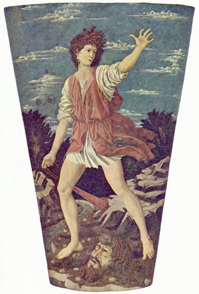 Editor: What strikes me immediately is the clear indication of physical exertion, almost palpable in how this St. Christopher strains against the waters. Curator: Indeed. Here we have Domenico Ghirlandaio's rendition of "St. Christopher," currently held at the Metropolitan Museum of Art. Note the subtle elegance infused into the otherwise sturdy figure. It exemplifies the artist's engagement with Italian Renaissance ideals. Editor: Engagement? I see a real tension. The sheer physical effort of bearing the Christ Child versus what seems like almost mass production in the tempera technique. How does that balance inform the piece's purpose? Curator: Precisely. Ghirlandaio navigates the intersection of divine narrative and earthly execution. His meticulous handling of light and shadow models the musculature of St. Christopher, anchoring it firmly in the naturalism revered during the Renaissance. He deploys an oil painting layering approach but with an unvarnished restraint, if that makes any sense. Editor: It does make sense. But I keep returning to the method: what paints were used, where the pigment came from, how his workshop enabled such precision, where would this go after completion and with whose labour would they achieve all of that. Were the choices of materiality intentional or conventional at this point for devotional images? Curator: An important point. While specific records elude us regarding pigment sources for this particular work, Renaissance masters generally relied upon ground minerals like ochre and lapis lazuli and their shops reflected a hierarchy of labour and knowledge, contributing to a codified style. This artwork’s intended function dictated choices in scale and coloration, but also was influenced by those cultural circumstances of materiality you mention. Editor: I concede there’s something incredibly moving in this tension—a material object attempting to express something so transcendent. In my mind it pushes against those cultural circumstances to embody a certain divine hopefulness within an artisan craft, to make sacred an everyday encounter with paint and panel. Curator: Beautifully stated. Ghirlandaio reminds us that even through deliberate artifice, devotional images evoke deeply felt encounters. Editor: An apt reminder about labor. The labour within art, and within ourselves. Curator: A worthy synthesis; through studying “St. Christopher”, we’ve illuminated our individual frameworks.