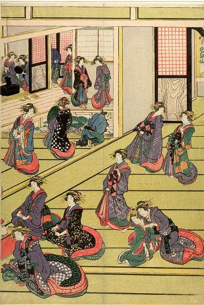 Editor: This is Hokusai's "Interior of a Yoshiwara Tea House." I'm struck by how he captures the bustling energy with such precise lines, almost like a stage set. What stands out to you about the symbolism in this piece? Curator: Notice how the figures are arranged, almost like actors in a Kabuki play. The courtesans, the guests… They all carry a certain weight, don’t they? What do their gestures and attire communicate to you about their roles? Editor: There's a sense of performance, definitely. The elaborate kimonos and stylized poses suggest a constructed reality. It's fascinating how Hokusai uses these symbols to hint at the complex social dynamics within the tea house. Curator: Precisely. Consider how the Yoshiwara district itself functioned as a carefully curated world, a space where social norms were both upheld and subverted. What deeper truths about desire and social hierarchy do you think Hokusai reveals here? Editor: This makes me rethink the entire composition. The "stage set" isn't just aesthetic; it's a deliberate commentary on social roles. Thanks, I appreciate this perspective!