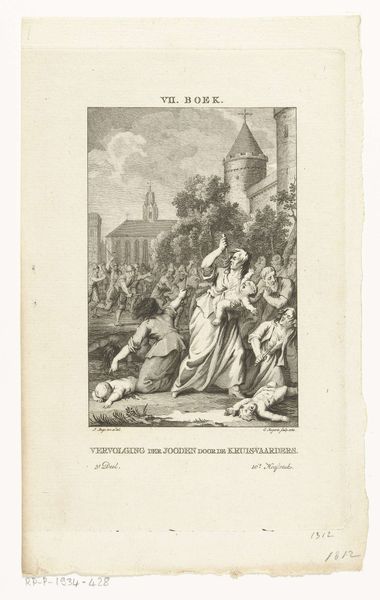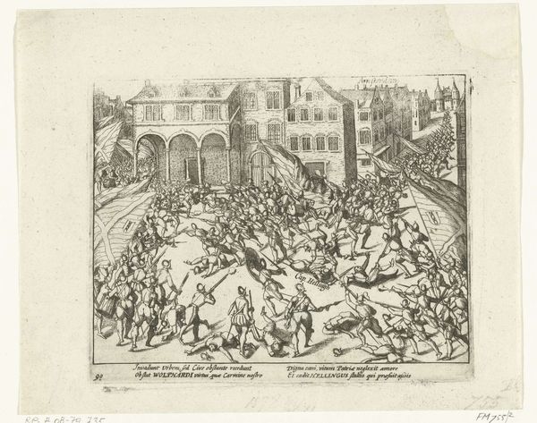 Jan Lucas van der Beek created this print, "Anabaptists Running Nude Across the Dam in Amsterdam, 1535," using etching techniques. The scene is dominated by the stark contrast of light and shadow, characteristic of etching, which adds a dramatic tension to the chaotic event depicted. The composition is carefully structured with the architectural backdrop providing a rigid, geometric contrast to the fluid, dynamic forms of the figures. This juxtaposition creates a visual tension that destabilizes the traditional notions of order and chaos. The artist uses line and form to construct a narrative that challenges fixed meanings, inviting us to question the boundaries of social norms and individual expression. The materiality of the print, with its fine lines and textured surfaces, enhances the sense of immediacy and rawness, drawing viewers into the historical and philosophical context of the Anabaptist movement. The print serves not just as a record, but as a provocative discourse on power, perception, and representation.