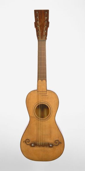 This guitar was made by D. & A. Roudhloff, from a variety of woods, and inlaid with decorative organic materials, like mother-of-pearl. The instrument’s beauty resides in the contrast between light and dark wood, offset by the pearly inlay. Look closely, and you'll see the high level of precision and hand-skill required to execute this design. The guitar reflects not only the traditions of luthiery, but also furniture making and marquetry. The selection of materials, along with the time taken to arrange them, elevate it from a purely functional object to a decorative one. Consider the labor involved: from sourcing materials to shaping and assembling each component. This raises questions about the cultural value we place on handmade objects versus mass-produced ones. Guitars like this one were once status symbols, but today, similar instruments can be made by machine at a much lower cost. By appreciating the craft, we recognize not just the object's beauty, but also the human effort embedded within it.