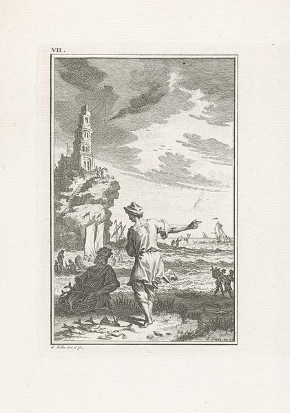 Editor: This is "Christus op een heuvel in gesprek met enkele engelen," or "Christ on a Hill Talking to Some Angels," a print by Reinier Vinkeles, made sometime between 1770 and 1816. The landscape has an almost dreamlike quality and seems so delicately rendered. It's amazing it was all done with engraving! What do you make of it? Curator: It's a captivating piece, isn't it? For me, it evokes a sense of profound contemplation, a solitary figure reaching towards the divine within the vastness of the natural world. The way Vinkeles uses line to create texture, almost a woven effect, invites me closer to uncover subtle revelations and meaning. It's history-painting through the lens of the artist's interpretation. I can almost hear the rustling leaves. How does it make *you* feel? Editor: I hadn't really noticed the texture before. It almost adds to that ethereal feel, a sense of the air itself shimmering with…revelation, as you say. What does the landscape contribute? Curator: Oh, the landscape is everything. It provides both a physical and spiritual context. Vinkeles, cleverly grounds Christ in a very real, meticulously rendered environment – see how detailed that ancient-looking structure is? This allows the supernatural event to somehow seem possible, made more believable by the detailed treatment and precision in lines of the terrestrial, mortal realm. Editor: That’s interesting, the contrast makes a point about faith perhaps, a convergence of heaven and earth. I was initially just impressed by the technical skill. Curator: Exactly! Vinkeles, really seems to encourage our search for deeper insight here. I will certainly spend more time examining the interplay between earthly details and ethereal beings next time.