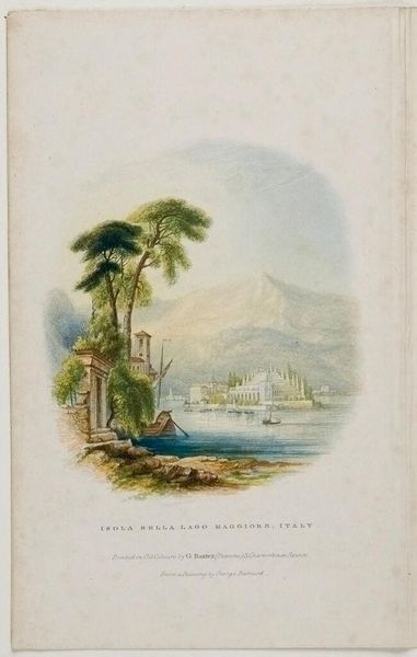 Curator: Mathias Gabriel Lory, active in the early 19th century, captured this serene "View of Isola Bella Taken from Stresa." The dimensions are roughly 25 by 23 centimeters. Editor: It strikes me as a study in tranquility. The composition, with its muted colors and reflective lake, creates a sense of stillness. Curator: The artist's placement of figures along the road suggests a relationship between the landscape and the emerging culture of tourism. This was a period of significant social change. Editor: Indeed, but I am more drawn to the geometric balance. The mountains mirror the building in the lake's reflection and the subtle gradations of color create a sense of depth. Curator: I'm interested in how Lory's landscapes contributed to a growing fascination with the picturesque, and shaped perceptions of Italy for a broader audience. Editor: Ultimately, this image, through its studied composition, offers a moment of respite—a visual poem celebrating stillness.