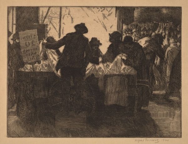 Leonard Pytlak made this lithograph, titled "Uncle Sam Wants You," in the United States. The print depicts a dimly lit recruitment office with a poster of Uncle Sam, a symbol deeply embedded in American cultural identity. The poster creates meaning through its visual codes and historical associations, specifically targeting young men to enlist for military service. Pytlak's artistic production was likely influenced by the social and political climate of his time. The absence of a date suggests the print may have been made during a period of military conflict or nationalistic fervor. The institutional history of military recruitment and the pervasive use of propaganda during wartime likely shaped the artwork's themes. This print serves as a commentary on the social structures of its time, particularly the role of art in promoting and normalizing military service. To better understand this artwork, we might examine military archives and recruitment records, as well as analyze the cultural context of war propaganda. Art serves as a powerful indicator of prevailing social attitudes.