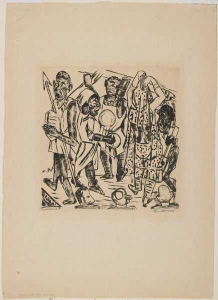 Curator: Oh, this print. When I first saw "Niggertanz" by Max Beckmann, well, there was just this raw, unsettling energy to it. It’s stark, wouldn’t you agree? Editor: Absolutely. The title itself speaks volumes about the problematic gaze through which Black bodies have historically been viewed and represented in art. Curator: It does provoke, doesn't it? Look at the figures, the way they're almost caricatured, and the general air of chaos. Beckmann's use of harsh lines definitely amplifies that sense of unease for me. It's grotesque, in a way. Editor: Grotesque, yes, but also reflective of the dehumanizing stereotypes perpetuated within early 20th-century European society. The "dance" becomes a spectacle, a performance of otherness. Curator: Exactly. And what's so compelling about Beckmann is his ability to channel that tension, that sense of societal unraveling, into something so visually arresting. Makes you wonder what demons he was wrestling with, eh? Editor: Perhaps the demons of his time, the pervasive racism and colonialism that shaped not only art but also social structures. Reflecting on that makes the artwork even more disturbing. Curator: Disturbing, yes, but isn't that the point? To make us confront those uncomfortable truths, those historical biases, head-on? Editor: I agree. It serves as a visual archive of harmful stereotypes, inviting critical engagement and hopefully, inspiring change.