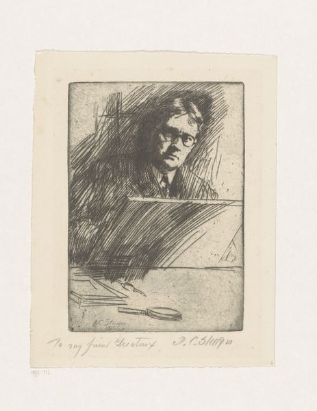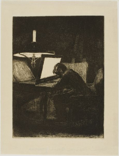Auguste Danse created this etching, "Young Engraver at Work", in 1865. It offers a fascinating glimpse into the world of artistic production in 19th-century Belgium. The image shows a young man, presumably an apprentice, diligently working at his engraving desk. The tools of his trade are prominently displayed, emphasizing the skilled labor involved in creating art. Made during a period of increasing industrialization, the print subtly critiques the changing landscape of labor. The work asks us to consider the value of traditional craftsmanship in an era dominated by mass production. By focusing on the engraver's focused concentration and the technical aspects of his work, Danse elevates the status of the artisan. Further research into the economic conditions of the art world in 19th-century Belgium can shed light on the artist's social commentary.