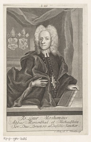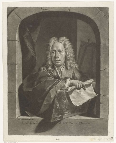Jean Daullé created this portrait of Pierre-Augustin Le Mercier, likely as an engraving, sometime in the mid-18th century. At first glance, the composition appears quite formal, almost rigid, with its central figure framed by architectural elements. Yet, look closer and the texture is revealed in meticulous detail. Notice how Daullé uses contrasting lines and shading to articulate depth and volume. The lines of the building and the stone balustrade on which Le Mercier rests are strong verticals and horizontals, which are countered by the softer, more organic forms of the wig. How does this contrast play into the symbolism of the piece? The wig, an undeniable status symbol of the time, is rendered with almost obsessive detail. This level of attention is perhaps a comment on the social mores of the period, emphasizing the importance of outward appearance and status. Ultimately, the print functions as both a representation and a critical examination of its subject and the society in which he lived.