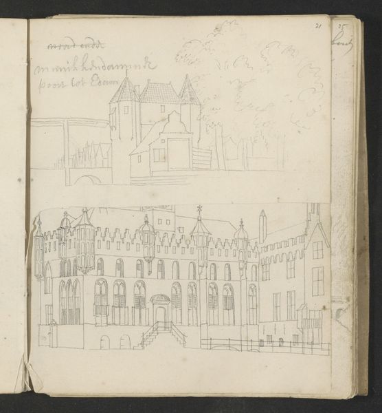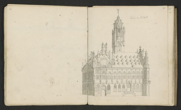 Curator: Oh, look at this! It’s from a sketchbook – a drawing in pen – titled 'Stadhuis en Waag te Hoorn' by Cornelis Pronk, made sometime between 1728 and 1732. Editor: Right away, I see labour and documentation here; a record of civic architecture of its time but presented as quick studies of material reality. I can imagine the artist quickly rendering building's structure in pen before moving to another site. Curator: Exactly! It feels so immediate, so personal. The Dutch Golden Age was quite fond of capturing cityscapes, but this… this has a certain intimacy to it. It’s like a whisper from the past, not a grand proclamation. I'm drawn to the aged paper. I can imagine the weight of it in my hands... the feel of its slightly rough texture. Editor: I'm thinking more about the economy of lines, how much information is contained within just a few strokes of the pen. This reminds me that drawing was not simply a pastime, but a skill – and mode for production and distribution of ideas - valued within the guilds. And there’s also the book itself; the binding, the paper... all were goods of the global supply chains that passed through a mercantile port like Hoorn. Curator: That’s fascinating, thinking about the larger systems that support artmaking, because, really, doesn’t every drawing have a bit of its time woven into its fibers? This isn't just stone and mortar, it’s commerce and culture shaping the landscape, and Pronk had the creative capacity to notice this transformation in architectural forms. It's quite marvelous to witness, if only we slow down. Editor: The medium itself is saying something, and pen and ink were essential to the administrative capacity of burgeoning bureaucracy, which gives it resonance that touches daily life as much as “Art." Pronk isn't creating timeless "high art" but more documentary images intended for different audience in that era. Curator: Yes, a document of transition! I find it freeing; it breaks away from expectations about artistry or precision to uncover glimpses and passing moments captured at that exact spot centuries ago, and a tangible moment of history which anyone can experience directly without much pre-existing training in appreciating art. Editor: And in looking at this sketch in its own time and context, perhaps we can consider more critically the idea of authorship; was this page something to sign and sell, or rather was it meant to perform useful work? The sketchbook, even more so than grand statements in oil, often invites questions about how visual records get created for different social goals, like planning or governing or conducting trade. Curator: Food for thought for our time, truly. This simple sketch offers us a window into a past world, yes, but also reflects back on how we choose to see, and shape our future. Editor: It encourages a greater consciousness of materials in creating any cultural forms.