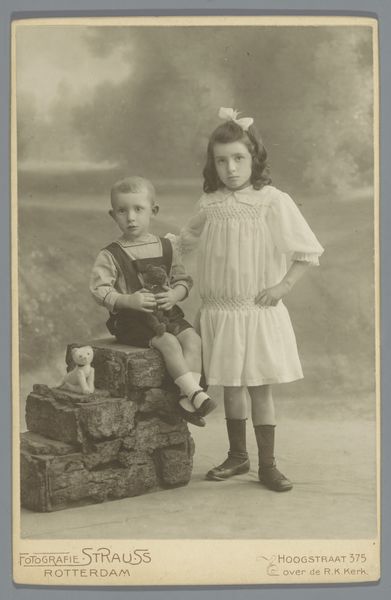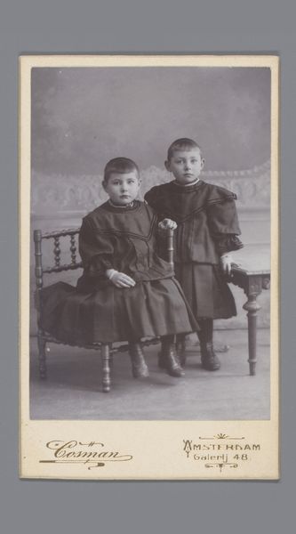 Curator: This gelatin silver print is one of several "Photographs from the Estate of Isabel Wachenheimer" dating between 1891 and 1896, by Anton Hruschka. Editor: Oh, my heart! They look like tiny, serious diplomats. So much gravity packed into those little faces, it's almost comical. Curator: The composition is typical for late 19th century portraiture. Note the painted backdrop simulating an outdoor garden scene, juxtaposed with the staged iron railing the children are posed upon. The lighting seems carefully calibrated to enhance their features and clothing. Editor: Absolutely. But, oh, look at their clothes! The girl's frilly dress and the boy’s sailor suit, all those buttons and little boots. I bet they itched like crazy, especially in the summertime. Do you think they knew each other, were siblings, or cousins maybe? Their expressions suggest an alliance against the ordeal of posing, perhaps. Curator: One can't know their relationship with certainty from the photograph, but it serves as an artifact of a specific socio-economic class at that time. This visual style communicates propriety, and social status is presented and maintained through its aesthetics and material production. Editor: Hmm, social status wrapped up in stiff collars and forced smiles. Even though it's staged and constructed for the sake of visual culture, that underlying sense of discomfort makes them somehow more alive, you know? What happened to them? What did they dream of beyond that photographer's studio in Strasbourg? It tickles the brain, the endless potential stories behind this moment frozen in silver. Curator: Indeed, the photograph functions on multiple levels. Its surface rigidity reveals undercurrents of vulnerability. And as a document, it invites us to project narratives upon these figures extracted from their historical setting. Editor: Yeah, sometimes the most ordinary old pictures end up feeling the most extraordinary, whispering little secrets from a world that’s completely vanished. Curator: It prompts contemplation regarding the constructed nature of identity. And the silent dialogue continues across eras through visual engagement.