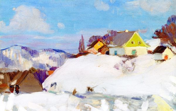 Editor: Clarence Gagnon's "The Ice Harvest," painted in 1923, offers an intriguing snapshot of rural life. The thick, almost sculptural use of oil paint is striking, and makes me wonder about the conditions and physical demands of ice harvesting itself. What can we discern about the labor involved simply by observing the materiality of the piece? Curator: That’s an insightful starting point. Think about the ‘plein-air’ tag – the artist painting outdoors, directly confronting the elements, mimicking in a way the labour of the workers portrayed. Gagnon's use of thick paint suggests not just the physicality of the landscape but also, perhaps, echoes the manual exertion inherent in extracting ice. What details in the painting lead you to that connection? Editor: The deliberate, almost chunky application of the paint, particularly in rendering the snow and the figure working… it doesn’t feel delicate. It communicates the weight and effort involved. Also, I’m curious about how this piece sits within Gagnon’s wider body of work. Curator: Indeed. Gagnon often depicted scenes of Canadian life, and we can look at this work as being within his project to construct an idealized vision of the Canadian landscape that would serve emerging tourism and nation-building interests in the early 20th Century. How might the ‘Ice Harvest’ speak to themes of both industry and the picturesque? Editor: So, the romanticism is layered on top of something much more grounded and gritty. Thinking about the marketplace and its impact complicates that initial feeling of serenity that the snow gives. Curator: Precisely. The picturesque aesthetic, achieved through distinct application of oil paints, overlays a socio-economic reality. It reminds us that how an image is made and circulated has concrete implications in the world. Editor: I’m beginning to see that what at first appeared to be a purely scenic depiction is deeply intertwined with the processes of production, representation and the market forces influencing both Gagnon’s vision and Canada’s image. Curator: And the materials of art become a lens through which to understand that complex interplay! It's a nice reminder of how deeply connected an artist is to a wider ecology of labour, consumption and visual rhetoric.