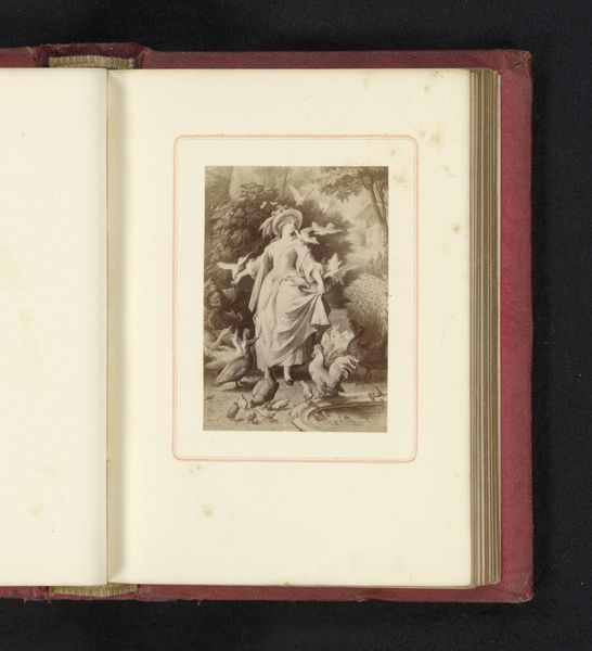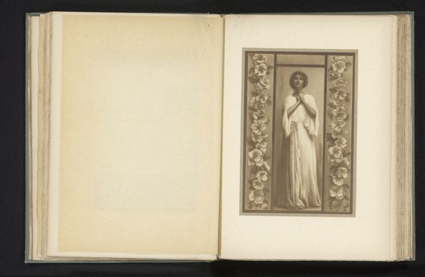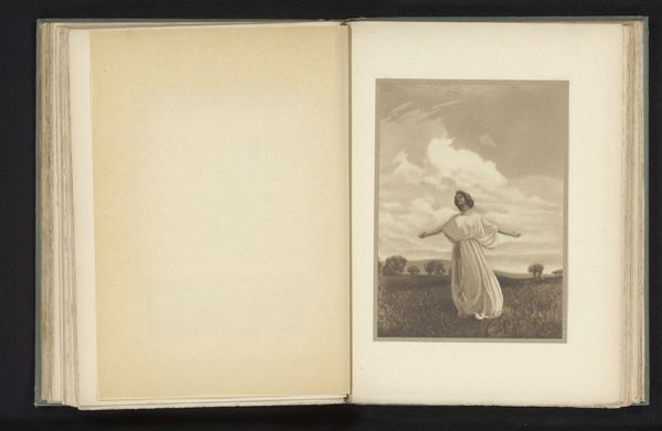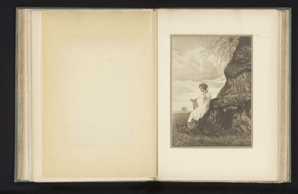 Curator: This subtle photograph is called "Vrouw zittend op een bank in een landschap met lelie," or "Woman sitting on a bench in a landscape with lily" by Adelaide Hanscom Leeson. The date on it is before 1916. What are your initial impressions? Editor: It's melancholic, isn't it? A pensive figure, almost dissolving into the soft-focus landscape, rendered in these delicate sepia tones. It evokes a sense of quiet contemplation. Curator: Absolutely. Leeson was active in the Photo-Secession movement, which championed photography as a fine art. Works like this challenged the dominance of painting and argued for photography's artistic merit and aesthetic potential, something fiercely debated within the institutions and artistic circles of her time. Editor: The lily itself is doing a lot of work here. Traditionally, lilies can symbolize purity, but also death and mourning. Paired with the woman's posture, it heightens that feeling of poignant reflection. The neo-impressionist soft brush strokes make it resemble a dream. Curator: Leeson drew upon a number of different traditions, but I'd agree the choice to photograph it resembling something like neo-impressionism aligns it with Symbolist ideals that flourished at the end of the nineteenth century and well into the 20th. Symbolism really tried to express intangible experiences, fears, or desires in art. Editor: So it's not just a portrait of a woman in a garden; it's an embodiment of an emotion. This image makes one consider ideas related to beauty, transience, the female experience during a period of rapid societal change. It reminds us how powerful imagery can be even when presented in a whisper. Curator: Leeson herself had a fascinating biography as well. Her own experiences contributed, one assumes, to her poignant expression here, using genre tropes, landscapes and symbolism to render deeply personal emotions on her figures. Editor: Looking at it again, there's a stillness that lingers, it encourages us to slow down, feel. Curator: Precisely, and consider its place within art history and female photography's crucial contribution.