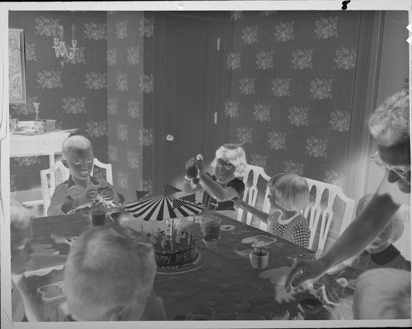 Curator: This gelatin silver print, likely from the mid-20th century, captures a seemingly simple scene: two girls opening presents. It is titled Untitled (two girls opening presents) and was created by Lucian and Mary Brown. Editor: There is a strange melancholy mood about it. The print's tonality and composition capture a moment of ephemeral joy against a backdrop of domestic clutter. Curator: I find the material choices interesting, especially given the social context of the time. The mass production of photographic materials allowed for intimate family moments to be recorded and preserved, a kind of everyday history. Editor: The dolls lined up on the bed feel like silent observers, almost a Greek chorus commenting on childhood and the fleeting nature of happiness. It makes me wonder about the photographer's intent, what story they are trying to tell. Curator: To me, it speaks about the democratization of image-making and the changing nature of family life. It also offers a window into the material culture of the time, the clothing, the toys, the domestic spaces. Editor: It's a poignant reminder of how even the most ordinary moments can hold profound beauty and a sense of longing. Curator: Indeed, a simple image that reflects the complexity of human experience.