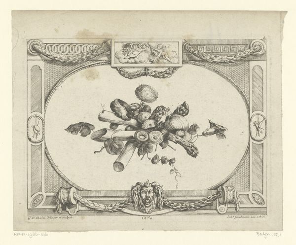 Gottlieb Friedrich Riedel designed this print, 'Vase with birds and fruits', sometime in the 18th century. The artist employed etching, a printmaking technique using acid to create lines in a metal plate, resulting in the fine details we see here. Notice the vase, adorned with birds and overflowing with fruit, a display of opulence. The texture, weight, and form of the fruit are all rendered with precision, almost as if you could reach out and pluck them from the page. Consider the skilled labor involved in creating this artwork. Etching demands precision, patience, and a deep understanding of materials. Riedel's expertise elevated a commercial process, printmaking, to a refined art form, and provided patterns for luxury goods. In his subtle way, Riedel challenges the rigid hierarchy between fine art and craft, reminding us that beauty and skill can be found in unexpected places.