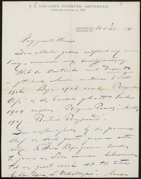 Editor: We're looking at "Brief aan Philip Zilcken," possibly from 1898, created by Johannes de Koo using pen, ink, and paper. It's quite intimate, almost like peering over someone's shoulder as they write a personal letter. What can you tell us about it? Curator: This piece offers a glimpse into the art world of the late 19th century. Letters like these weren’t just personal correspondence; they formed a crucial network of exchange and influence amongst artists, critics, and dealers. The very act of De Koo choosing pen and ink—media accessible and immediate—speaks to a certain intimacy and directness, but it also hints at the economic realities for some artists at the time. Do you get a sense of who Zilcken was and what his role might have been? Editor: It makes me think about artistic communities and how artists supported each other, or perhaps tried to get ahead. Was Philip Zilcken another artist, maybe? Someone with influence? Curator: Exactly. Zilcken was a well-known artist, critic, and editor himself. This letter may reveal De Koo attempting to connect with him and to position himself within that social sphere. Consider how artistic reputations were built, not just on talent, but on strategic relationships. Is there anything in the style of the letter itself that says something to you about the relationship between the two people? Editor: It’s a casual script. You're right; there is an air of professional familiarity here, which also points to the social context of the late 19th-century art scene, and the politics of creating and circulating art. Curator: Indeed. The letter format emphasizes that art making does not exist within a vacuum. It encourages one to consider what this all meant at the time this was penned. Editor: This really shifted my perception of this piece, it is not just a simple note on paper. Curator: Yes, art has a profound public life. Looking closer allows a glimpse of that world of making, of sharing, of relating.