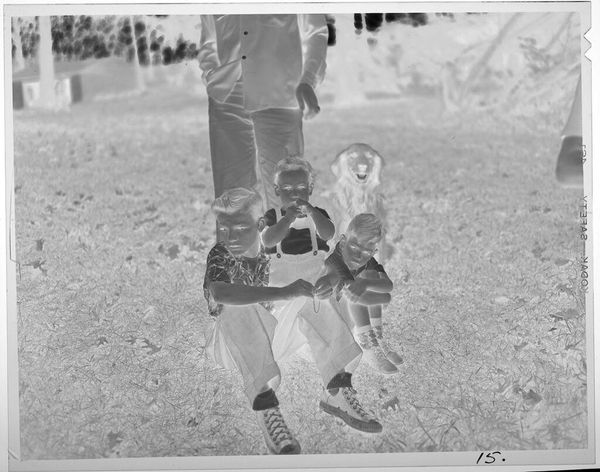 Curator: This photograph, created by Lucian and Mary Brown, shows three boys sitting on a brick wall. It's a small gelatin silver print. Editor: The inverted tones create an otherworldly feel. It makes me think about visibility and representation. Curator: Absolutely. Light and shadow are potent symbols, here perhaps reflecting the hidden aspects of childhood experience. Editor: Or, more overtly, the complex relationship of Black individuals to image-making and self-representation within a white-dominated society. Curator: Perhaps it speaks to the inherent contradictions of innocence, or the way that light and dark coexist in the human soul. Editor: It could also point to the ways in which Black joy is so often forced to exist in the shadows of systemic injustice. Curator: The image evokes a powerful, unsettling ambiguity. Editor: It’s a haunting reminder of whose stories get told, and how.