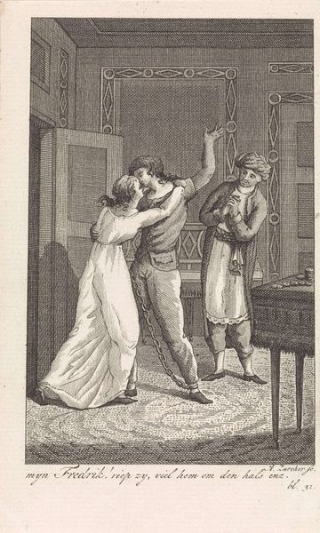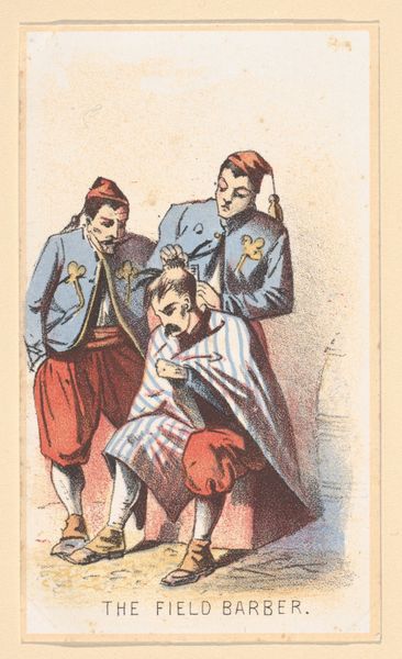 Curator: The small print titled “Good Bye” from the Harvard Art Museums presents us with a soldier and a woman in what appears to be a farewell embrace. Editor: There’s a striking tension here. The softness of their embrace is sharply contrasted by the soldier’s stern face and the weight of his gear. You immediately feel the historical weight and the sense of personal sacrifice. Curator: Indeed, the soldier's accoutrements—his rolled blanket and canteen—are potent symbols of duty. It’s a visual shorthand for the disruption of war, echoing classical iconography of departure. Editor: And this tender moment is tinged with the ever-present socio-political realities of gendered expectations during wartime, when women were often left behind to maintain home and hearth, their agency limited. Curator: Yes, this image resonates with the archetypal image of longing. It also speaks to broader themes of love and separation. The artist, though anonymous, manages to capture a universal feeling. Editor: It leaves one contemplating the complex intersections of war, gender, and personal histories, doesn't it? Curator: It does, and it reminds us that even the smallest of images can hold profound emotional and symbolic weight.