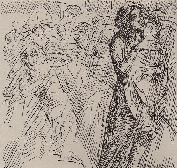 Curator: Before us is "Kneeling Figures Huddled Together," an ink drawing on paper of unknown date by George Romney. What's your immediate take? Editor: It projects a feeling of desperate supplication, a silent cry from figures bound together in some shared anguish. Curator: Romney's command of line here is masterful. Observe how the repetition of downward curves and angled contours contributes to a rhythm, drawing our eyes upwards. It really emphasizes the architectural, formal qualities. Editor: Yes, but those stark contrasts, the almost frantic energy of the strokes… they speak to a period of profound upheaval. Romney lived through the height of British imperial power but also witnessed increasing social unrest. What's their place within this structure? Curator: Structurally, I appreciate how the ambiguous space focuses our attention solely on the figures. Romney denies us a background, instead he relies on the interplay of light and shadow created through the application of the ink wash to build depth. Editor: Is this meant to be timeless though? These figures huddled together might evoke anxieties around displacement and societal breakdown that still reverberate strongly. Curator: Perhaps. Consider, however, the formal choices that Romney executes; the strategic use of negative space creates a void. Their orientation and connection establish the work’s pictorial logic. Editor: I suppose, seeing the bare shoulders, some almost childlike features, raises questions. Is it innocence, perhaps a commentary on exploitation or the loss thereof in such conditions? Are they hoping? Are they desperate? Or is this a deliberate choice by the artist to use such emotive representations within this scene of struggle? Curator: The questions the artwork evokes speak to its powerful capacity for expression beyond literal representation. Romney seems interested more broadly with psychological or spiritual effects on canvas as much as the realities facing contemporary viewers. Editor: Precisely, Romney’s sketch reminds us that art, even in its formal elegance, is always in conversation with the world. This drawing reveals so much about the period it was created in but still can connect and affect all.