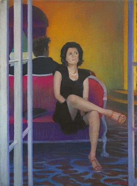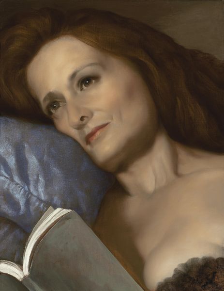 Curator: Here we have David Michael Bowers’ portrait of Kathleen Rooney. What catches your eye? Editor: The sheer constructed nature of the setting. From the balustrade to the imported tropical plants, it is a staged vision of leisure. The details, like the embroidered fabric of her shirt, speak of specific craft practices and supply chains. Curator: Absolutely, it evokes notions of class and access. Rooney, as the subject, is carefully positioned within a nexus of privilege, enhanced by both the artistry and the constructed environment. Think about how portraiture traditionally served as a display of status and identity. Editor: And it’s crucial to consider the oil paint itself. The smoothness achieved speaks to specific grinding methods, pigment choices, and the history of paint production as industry, transforming raw materials into art. Curator: Right. We can view this piece as navigating the representation of women in domestic settings—a historical trope, reimagined. Her direct gaze and relaxed posture challenge notions of passive femininity; her intellect is on display with the book. Editor: Yet, there’s also a disconnect for me. The implied wealth is presented almost blandly. There’s very little sign of process, and the painting flattens what might be very complex class and gender relationships, reducing them to symbols. Curator: Perhaps. Still, the painting offers a complex study. It acknowledges inherited forms and plays with visual tropes to underscore questions about identity. How can someone create their own vision in the world through careful acts of curating place, possessions, and image? Editor: Ultimately, looking at the craftsmanship alongside those questions makes me wonder: what specific types of labor supported her lifestyle and how is that obscured by the finished, polished product? Curator: Good point. It is this juxtaposition of ease and a certain anxiety surrounding the sources of wealth that keeps it provocative for a modern audience. Editor: For me too! And it reminds us to remain critically engaged with how images reinforce social hierarchies and make choices visible, when it is convenient.
