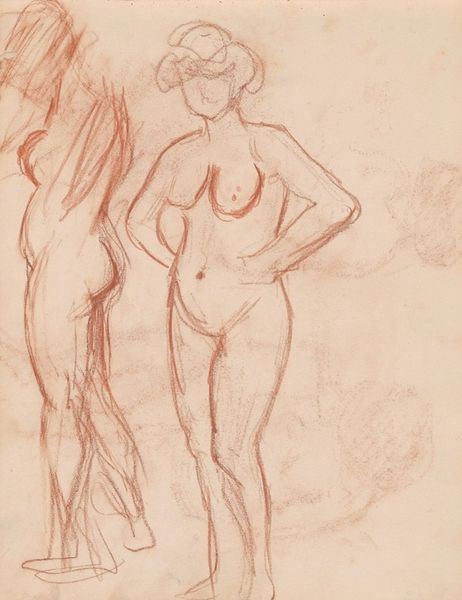 Eduard Bendemann created these sketches of a sitting woman in pencil on paper. Bendemann was part of the Düsseldorf school of painting in Germany, which emphasized narrative and historical subjects. In this study, we see the artist exploring the female form through different poses. These rapid sketches provide insight into the conventional artistic training of the time, with its strong emphasis on life drawing. There is an undeniable tension here: the depiction of the female nude has historically been a way for male artists to assert control over the female body, yet there's an undeniable element of the gaze, or the artist's fascination with the model’s form. How do we reconcile the intimacy and vulnerability of the model with the power dynamics inherent in this artistic practice? The sheet also contains studies of men, reminding us that the artist's eye was trained on both male and female bodies, albeit through different social lenses. This drawing reveals the complex interplay of gender, representation, and artistic convention in 19th-century art.