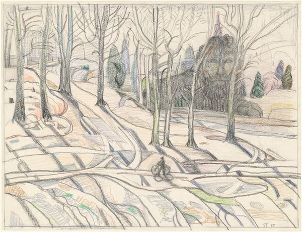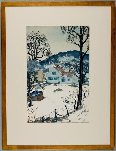 Editor: We’re looking at "Cottage in the Winter Sun," a 1962 woodcut print by Ivan Batechko. I find it has a peaceful, almost melancholic feel, especially with the bare trees against the bright snow. What captures your attention when you view it? Curator: What strikes me is the artist's portrayal of the winter landscape under a socio-political lens. Consider the year: 1962. Batechko was working in a post-Stalin Soviet Union. The artwork, seemingly a simple landscape, presents a tension. It could be seen as an embrace of the traditional Russian countryside, subtly valorizing it amidst rapid industrialization and urbanization policies dictated by the state. Editor: So, you're suggesting that what appears as a purely aesthetic choice, a landscape, could carry deeper cultural meaning? Curator: Precisely! The visual composition uses strong, simplified shapes, which reflect the aesthetics promoted by Soviet Realism but might simultaneously hint at a longing for a more idyllic, less-controlled past. Where did the artists exhibit, and what audience were they trying to engage? These factors dramatically shape how a landscape print like this gets created and perceived. Consider who would have access to art; was it part of broader propagandist projects? Editor: I hadn’t thought of it that way, but the institutional context certainly shifts my understanding. So even an innocent-looking winter scene could have been charged with ideological meaning in its time. Curator: Exactly. The power of art lies not just in what is shown, but also in how and where it's shown. It compels us to examine the intersection of individual expression and political ideology. Editor: That's a great point. It's made me think a lot more about how historical context impacts artistic choices and interpretation. Curator: Likewise. It is important to ask the broader question, how the value of ‘realism’ in this piece would be seen, either approved or not, within Soviet Realism.