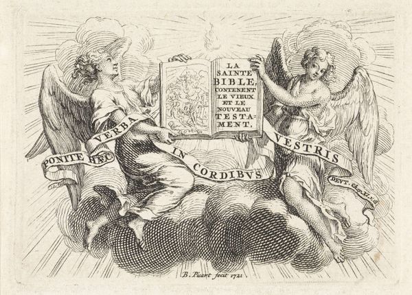 Editor: Here we have an engraving titled "Ornament met allegorie op eenheid," or "Ornament with allegory of unity," created sometime between 1683 and 1783 by an anonymous artist. It reminds me of an emblem, with its symbolic figures. What do you see when you look at this piece? Curator: Immediately striking is the intricate line work. The composition adheres to a strong symmetry, divided centrally by what appears to be a fasces, symbolizing unity and power. The cherubic figures, or putti, positioned on either side, contribute to this balanced construction. Notice the scales held above each cherub; these are in perfect equilibrium, a crucial element of the overall formal arrangement. Editor: Yes, the balance is undeniable. The objects held by the putti seem significant too. Are these visual keys for deciphering the engraving’s message? Curator: Precisely. Focus on how the artist juxtaposes these objects. The tools the cherubs use invite us to think about industry, commerce, even perhaps learning and knowledge. They function almost like linguistic signs – elements within a visual language. Now, consider the 'frame' around the composition; do these add or detract from the central scene, and why? Editor: The frame, a cornucopia overflowing with coins, seems almost separate from the more formal central element, lending richness, I suppose. And you see this design from a formalist perspective, primarily focusing on its structure? Curator: Indeed. One decodes a work by paying close attention to form. The line, composition, balance, symmetry – these are entry points into grasping what this emblem wishes to convey about 'unity'. What initially appeared merely decorative reveals a complex system of signs, waiting to be unlocked. Editor: So, form precedes function, or, at the very least, guides us towards it. Thanks, I'm looking at it completely differently now!