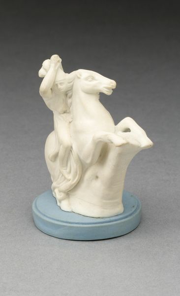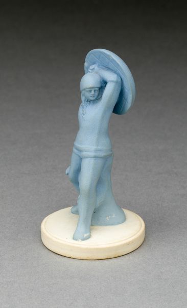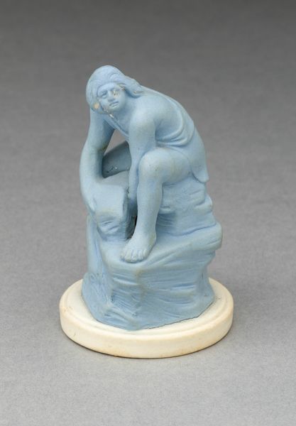Editor: So, this is “Chess Piece: Pawn,” a ceramic sculpture from the 19th century, attributed to Wedgwood Manufactory. There's a contemplative, almost mournful mood to it. It’s small, delicate… What stands out to you in this piece? Curator: What I see first is the Neoclassical form striving to capture an emotional narrative. The pawn, in chess, is often seen as the most vulnerable, expendable piece, yet this figure possesses a thoughtful humanity that elevates it beyond mere strategic function. It embodies the human capacity for resilience. How does this resonate with you? Editor: That’s interesting. It’s true, chess pawns can be promoted to queens, so, I see a transformation... Maybe this sculpture captures the turning point. Is this common in chess piece art? Curator: Not particularly for chess pieces, no. The power here lies in subverting the object's symbolic meaning through representational visual language. What do you feel when viewing its position? It is not, after all, 'standing', nor fighting - the poses common to the visual language surrounding chess pieces. Editor: It does look uncomfortable; hunched over. Almost imprisoned by the rough rocky plinth that contrasts with the smooth finish of the human figure. It highlights the burden carried by the everyman or everywoman. How does the medium impact the overall cultural reading? Curator: Wedgwood was a titan in ceramics. His factory brought classical themes into domestic spaces, bridging the elite and the everyday. The choice of ceramic democratizes the symbolism; everyone, no matter their economic or cultural status, becomes a character in an ancient drama. Editor: I didn't think of it that way before. It is more than a simple chess piece - it has been designed to elicit feeling, too. Curator: Indeed. Consider how our understanding of the world is filtered through the objects we choose to surround ourselves with. And this sculpture serves as a mirror, prompting reflection. Editor: Absolutely. It highlights the layers of cultural memory embedded within seemingly simple forms, making me question established visual relationships. Thank you for revealing what this pawn symbolizes in our memories.